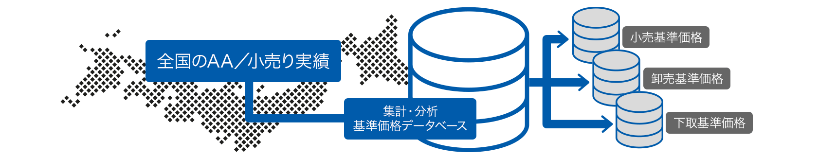AAや小売の実績を集計・分析し、車種・型式・グレード等のカタログ情報及び年式ごとに毎月の基準価格を算出しています。