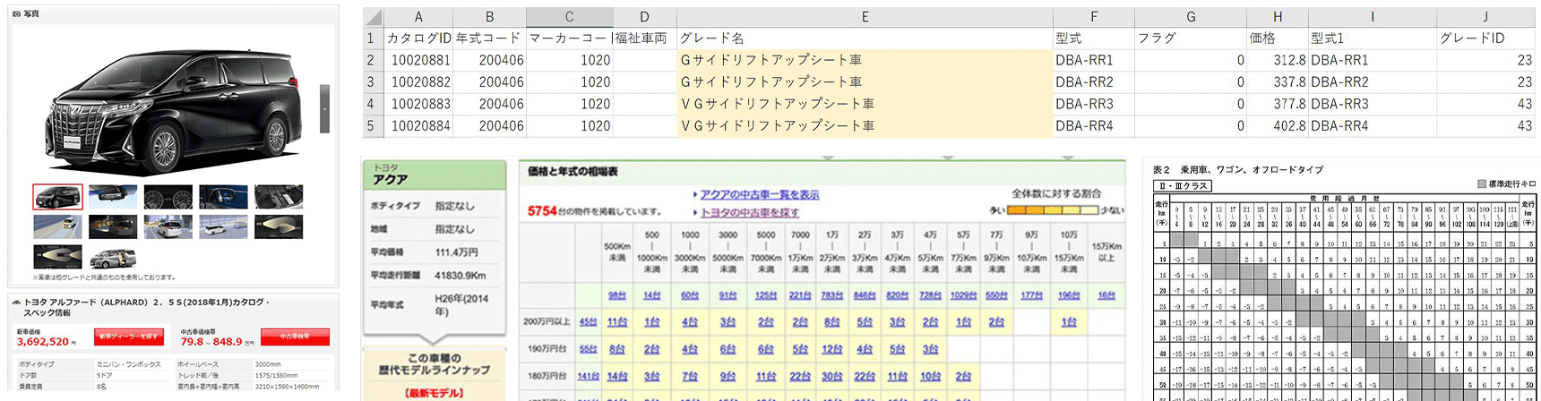 過去の様々な車種のモデルごとに応じたAA実績を集計・分析し、車種・型式・グレード等のカタログ情報に基づき毎月各車種の予測率・予測価格を算出したものとなります。