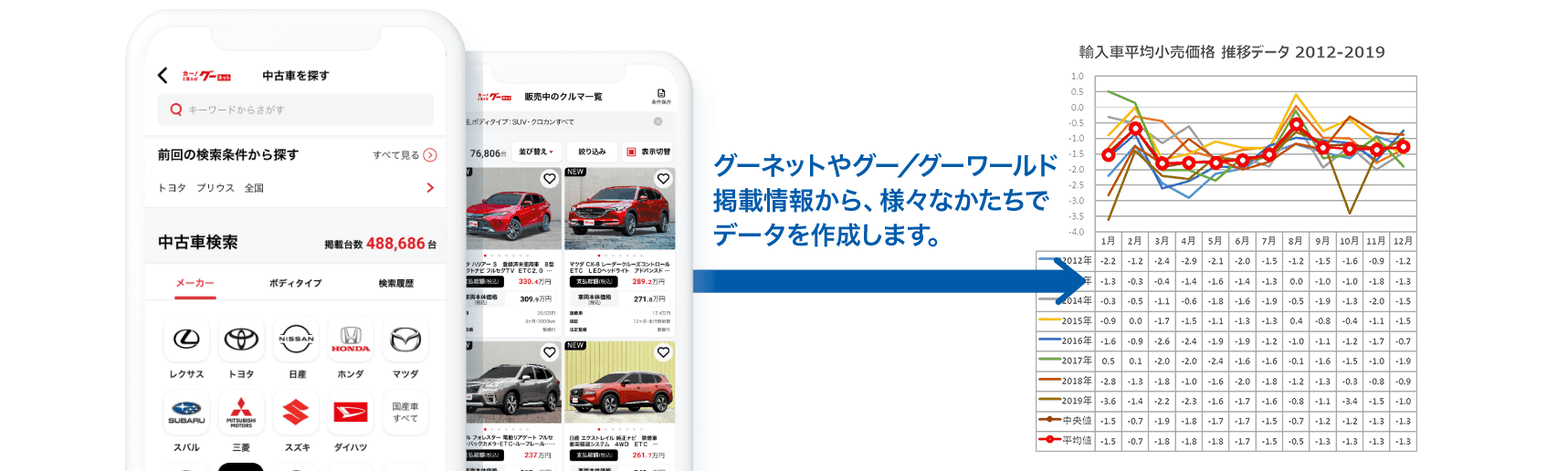 AAや小売の実績を集計・分析し、車種・型式・グレード等のカタログ情報及び年式ごとに毎月の基準価格を算出しています。