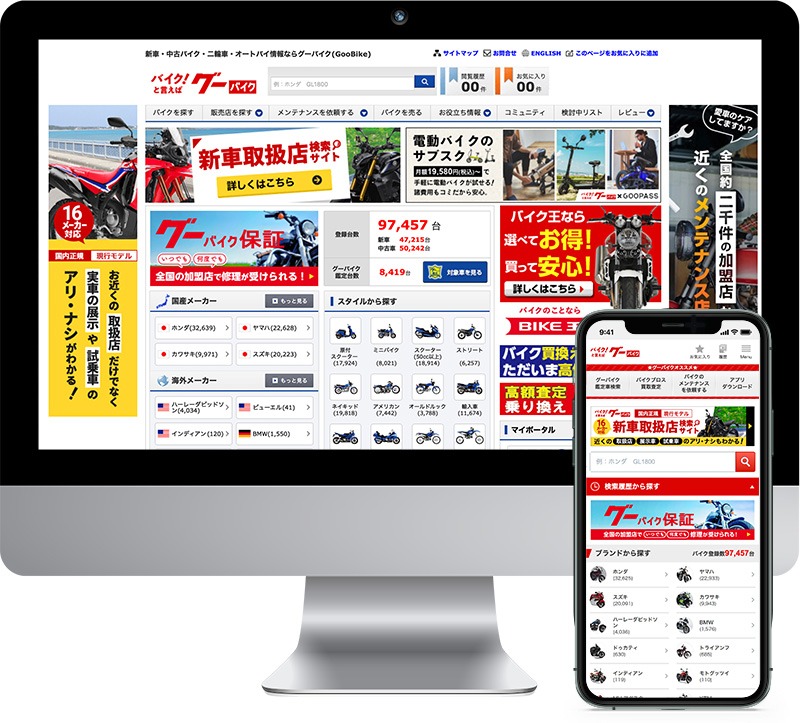 グーバイクの物件情報を検索できるだけでなく、保険の見積もりやローンの申込みなど、オリジナルの情報も充実したインターネットサイト。バイクを買いたい人も、活用したい人も必見です。